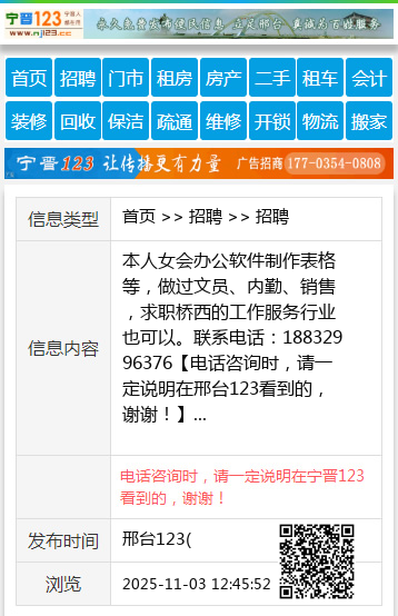 本人女会办公软件制作表格等,做过文员、内勤、销售,求职桥西的工作服务行业也可以。联系电话:18832996376 【电话咨询时,请一定说明在邢台123看到的,谢谢!】 |