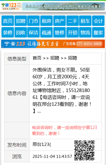 外围保洁,男女不限。50至60岁,月工资2000元,4天公休,工作时间7小时,地址博物馆附近,15512818061 【电话咨询时,请一定说明在邢台123看到的,谢谢!】 |