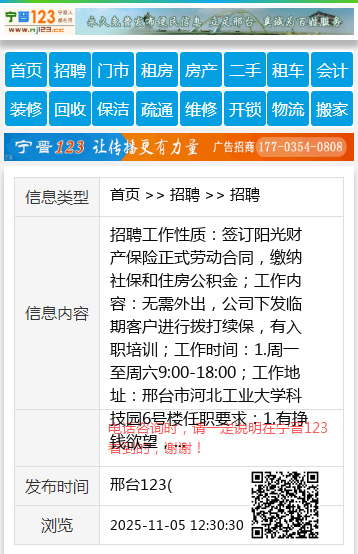 招聘工作性质:签订阳光财产保险正式劳动合同,缴纳社保和住房公积金;工作内容:无需外出,公司下发临期客户进行拨打续保,有入职培训;工作时间:1.周一至周六9:00-18:00;工作地址:邢台市河北工业大学科技园6号楼任职要求:1.有挣钱欲望,43以下;2.具有基本的电脑操作水平;3.专业不限,同时欢迎其他专业优秀毕业生加盟。18515094969 聘 【电话咨询时,请一定说明在邢台123看到的,谢谢!】 |