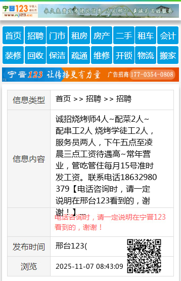 诚招烧烤师4人~配菜2人~配串工2人 烧烤学徒工2人,服务员两人,下午五点至凌晨三点工资待遇高~常年营业,管吃管住每月15号准时发工资。联系电话18632980379 【电话咨询时,请一定说明在邢台123看到的,谢谢!】 |