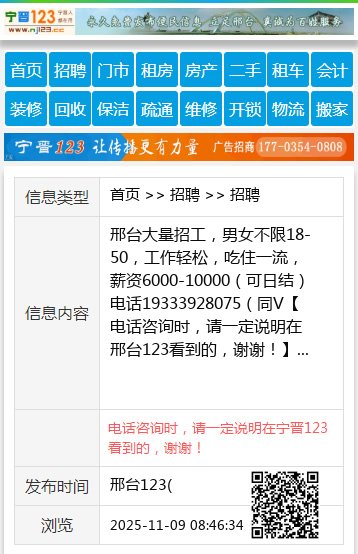 邢台大量招工,男女不限18-50,工作轻松,吃住一流,薪资6000-10000(可日结)电话19333928075(同V