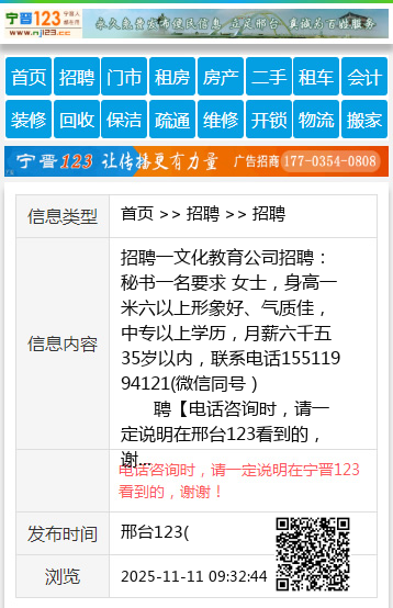 招聘一文化教育公司招聘:秘书一名要求 女士,身高一米六以上形象好、气质佳,中专以上学历,月薪六千五35岁以内,联系电话15511994121(微信同号) 聘 【电话咨询时,请一定说明在邢台123看到的,谢谢!】 |
