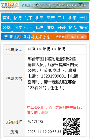 邢台市图书馆附近招聘公墓销售人员,底薪+提成+四天公休,年龄40岁以下。联系电话: 13231999001 【电话咨询时,请一定说明在邢台123看到的,谢谢!】 |