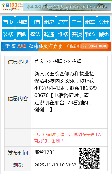 新人民医院西侧万和物业招保洁45岁内3-3.5k,秩序岗40岁内4-4.5k,联系18632908676 【电话咨询时,请一定说明在邢台123看到的,谢谢!】 |