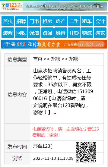 山泉水招聘销售员两名,工作轻松简单,有提成无任务要求,35岁以下,男女不限,正常班,电话微信15130906016 【电话咨询时,请一定说明在邢台123看到的,谢谢!】 |