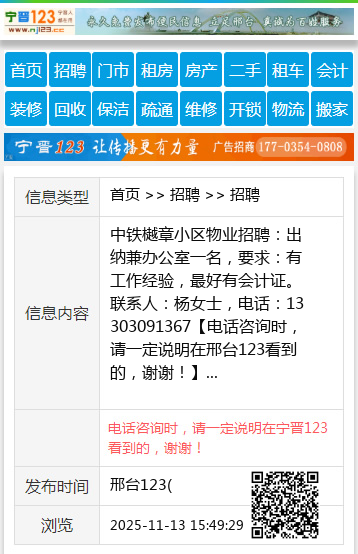 中铁樾章小区物业招聘:出纳兼办公室一名,要求:有工作经验,最好有会计证。联系人:杨女士,电话:13303091367 【电话咨询时,请一定说明在邢台123看到的,谢谢!】 |