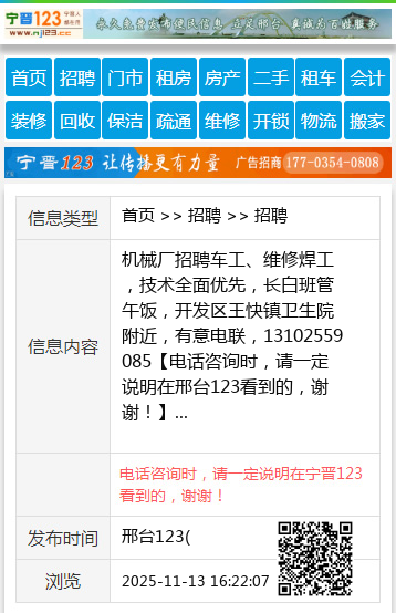 机械厂招聘车工、维修焊工,技术全面优先,长白班管午饭,开发区王快镇卫生院附近,有意电联,13102559085 【电话咨询时,请一定说明在邢台123看到的,谢谢!】 |