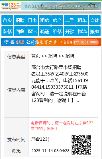 邢台市太行路菜市场招聘一名员工35岁之40岁工资3500元能干,吃苦。电话15613904414.15933373011 【电话咨询时,请一定说明在邢台123看到的,谢谢!】 |