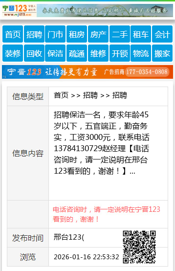 招聘保洁一名,要求年龄45岁以下,五官端正,勤奋务实,工资3000元,联系电话13784130729赵经理 【电话咨询时,请一定说明在邢台123看到的,谢谢!】 |