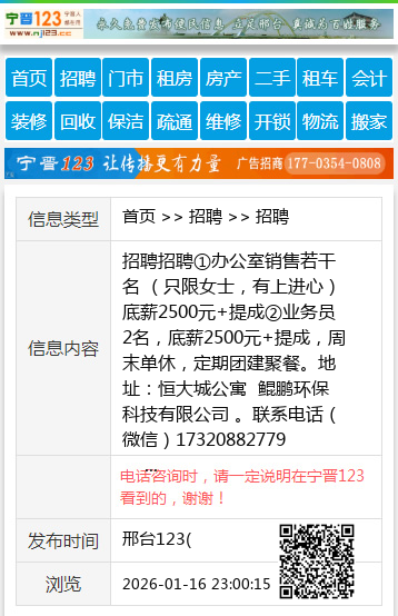 招聘招聘①办公室销售若干名 (只限女士,有上进心)底薪2500元+提成②业务员2名,底薪2500元+提成,周末单休,定期团建聚餐。地址:恒大城公寓 鲲鹏环保科技有限公司 。联系电话(微信)17320882779 聘 【电话咨询时,请一定说明在邢台123看到的,谢谢!】 |