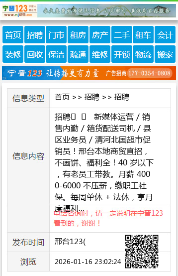 招聘 新媒体运营 / 销售内勤 / 箱货配送司机 / 县区业务员 / 清河北国超市促销员!邢台本地商贸直招,不画饼、福利全!40 岁以下,有老员工带教。月薪 4000-6000 不压薪,缴职工社保。每周单休 + 法休,享月度福利、评优奖金,免费旅游团建 + 年度体检。地址:邢台信都区新兴西大街与滨江路交叉口金牛冷库 电话:18713975516 团队氛围好无内耗,找稳定工作直接来电! 聘 【电话咨询时,请一定说明在邢台123看到的,谢谢!】 |