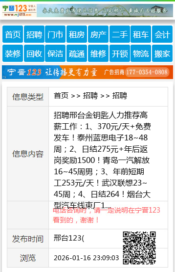 招聘邢台金钥匙人力推荐高薪工作:1、370元/天+免费发车!泰州蓝思电子18~48周;2、日结275元+年后返岗奖励1500!青岛一汽解放16~45周男;3、年前短期工253元/天!武汉联想23~45周;4、日结264!烟台大型汽车线束厂18~38周;5、周结工资年前短期310跨年340元/天!安徽大型车企18~40周;6、年前短期工日结275!上海坐班小马达厂18~42周;7、年前短期工日结210!廊坊食品厂22~45周;8、年前短期工日结170~200元/天!青岛食品厂17~60周;9、常年招聘北京保安、保洁、中控、安检,18~60均可安排;更多工作加微信看朋友圈:15530901546 聘 【电话咨询时,请一定说明在邢台123看到的,谢谢!】 |