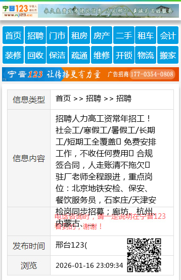 招聘人力高工资常年招工!社会工/寒假工/暑假工/长期工/短期工全覆盖✅ 免费安排工作,不收任何费用✅ 合规签合同,人走账清不拖欠✅ 驻厂老师全程跟进,重点岗位:北京地铁安检、保安、餐饮服务员,石家庄/天津安检岗同步招募;廊坊、杭州、内蒙古、昆山多地多岗可选,同学、同校可安排同企业、同宿舍📞 咨询热线:18830970784(微信同号) 聘 【电话咨询时,请一定说明在邢台123看到的,谢谢!】 |