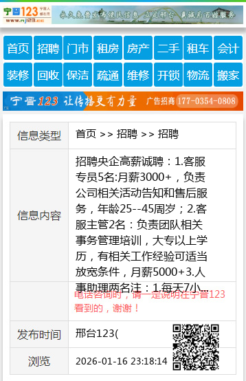 招聘央企高薪诚聘:1.客服专员5名:月薪3000+,负责公司相关活动告知和售后服务,年龄25--45周岁;2.客服主管2名:负责团队相关事务管理培训,大专以上学历,有相关工作经验可适当放宽条件,月薪5000+3.人事助理两名注:1.每天7小时工作制,周末双休 2.养老医疗保障 3.系统培训机制,晋升空间大;国企招聘一辈子有保障李经理:15830726364 聘 【电话咨询时,请一定说明在邢台123看到的,谢谢!】 |