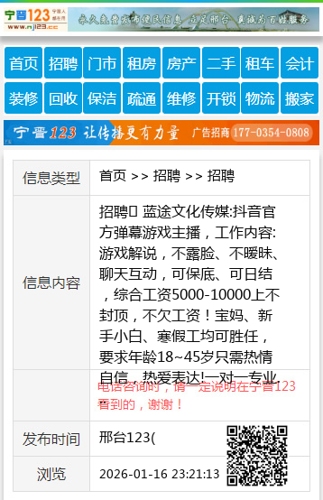 招聘 蓝途文化传媒:抖音官方弹幕游戏主播,工作内容:游戏解说,不露脸、不暧昧、聊天互动,可保底、可日结,综合工资5000-10000上不封顶,不欠工资!宝妈、新手小白、寒假工均可胜任,要求年龄18~45岁只需热情自信,热爱表达!一对一专业培训+流量扶持+设备+舒适环境,兼职/全职均可,地址 :襄都区邢东市场万泉汇商务楼1113室。梁主任15612901850 聘 【电话咨询时,请一定说明在邢台123看到的,谢谢!】 |