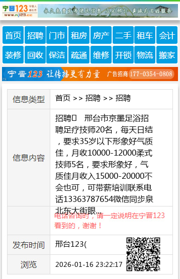 | 防骗提醒: | 邢台123(www.xingtai.wang)提醒您:手工活、网络兼职、刷单,都是骗子!凡以各种名义收取费用的都是骗子!找工作是往兜里挣钱,让你往外掏钱的都是骗子!异地招聘请提高警惕,谨防诈骗! |