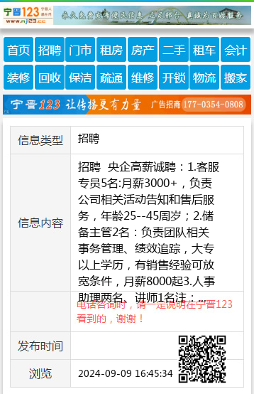 招聘 央企高薪诚聘:1.客服专员5名:月薪3000+,负责公司相关活动告知和售后服务,年龄25--45周岁;2.储备主管2名:负责团队相关事务管理、绩效追踪,大专以上学历,有销售经验可放宽条件,月薪8000起3.人事助理两名、讲师1名注:1.7小时工作制,周末双休 2.养老医疗保障 3.系统培训机制,晋升空间大;国企招聘一辈子有保障15932196105 聘 |