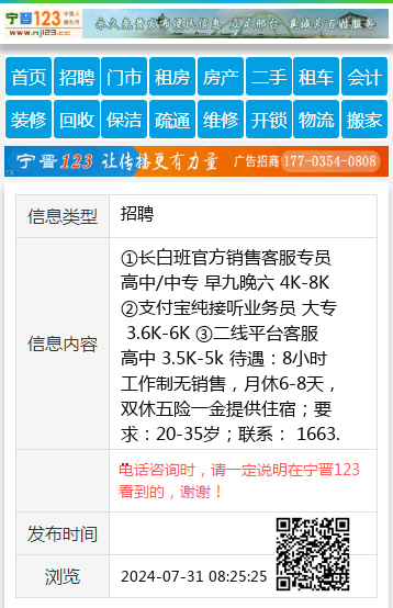 ①长白班官方销售客服专员 高中/中专 早九晚六 4K-8K ②支付宝纯接听业务员 大专 3.6K-6K ③二线平台客服 高中 3.5K-5k 待遇:8小时工作制无销售,月休6-8天,双休五险一金提供住宿;要求:20-35岁;联系: 16633966915/17633190052