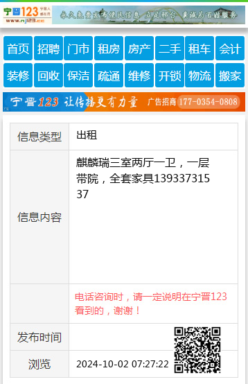 麒麟瑞三室两厅一卫,一层带院,全套家具13933731537