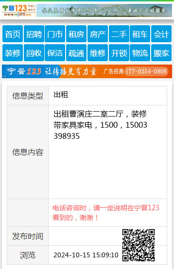 出租曹演庄二室二厅,装修带家具家电,1500,15003398935