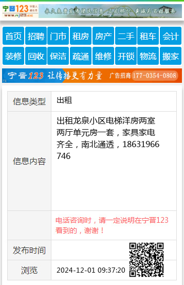出租龙泉小区电梯洋房两室两厅单元房一套,家具家电齐全,南北通透,18631966746