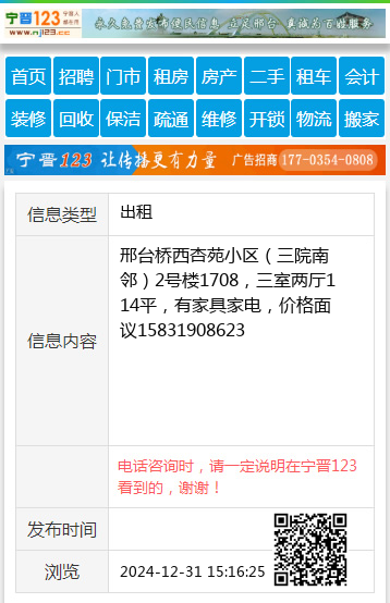 邢台桥西杏苑小区(三院南邻)2号楼1708,三室两厅114平,有家具家电,价格面议15831908623