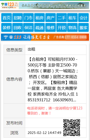 【合租房】可短租月付300-500元不等 主卧带卫500-700.桥东(襄都)天一城周边; 桥西(信都)居然之家周边; 开发区。【整租房】精品一居室,两居室 各大商圈学校 家具家电齐全 拎包入住 18531931712 16630969103 信同号 【另收市区 空房 简装 精装房 长期招聘房产经纪人】