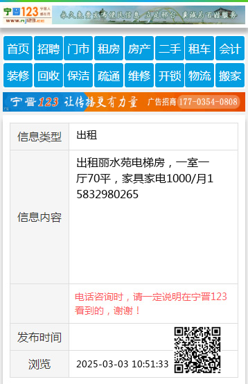 出租丽水苑电梯房,一室一厅70平,家具家电1000/月15832980265