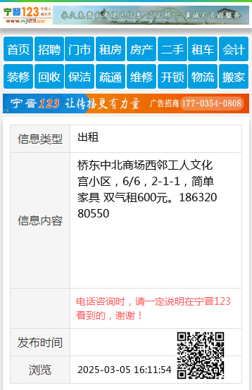 桥东中北商场西邻工人文化宫小区,6/6,2-1-1,简单家具 双气租600元。18632080550