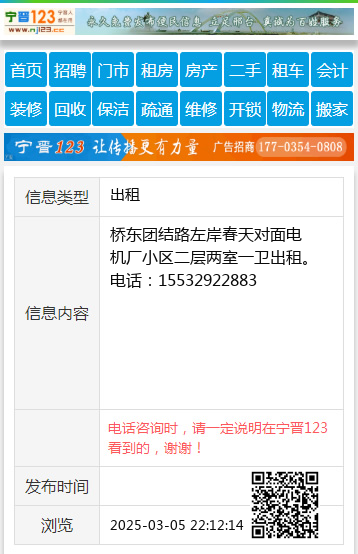 桥东团结路左岸春天对面电机厂小区二层两室一卫出租。电话:15532922883