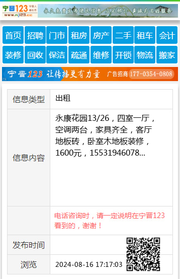 永康花园13/26,四室一厅,空调两台,家具齐全,客厅地板砖,卧室木地板装修,1600元,15531946078