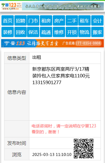 新京都东区两室两厅3/17精装拎包入住家具家电1100元13315901277