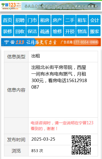 出租北长街平房带院,西屋一间有水有电有燃气,月租300元,看房电话15612918087