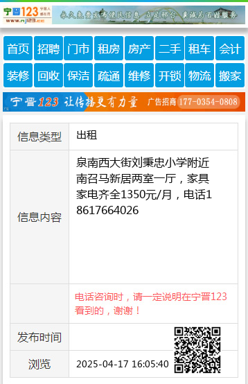 泉南西大街刘秉忠小学附近南召马新居两室一厅,家具家电齐全1350元/月,电话18617664026