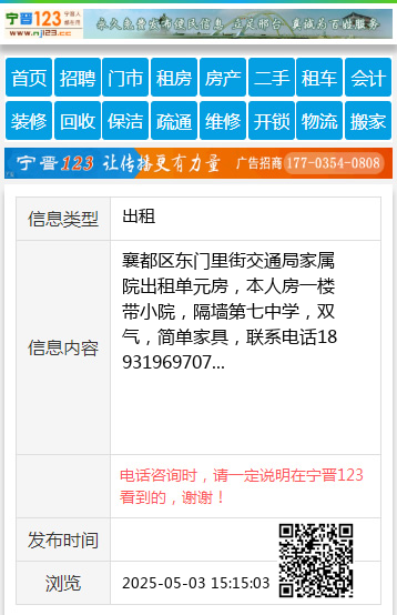 襄都区东门里街交通局家属院出租单元房,本人房一楼带小院,隔墙第七中学,双气,简单家具,联系电话18931969707