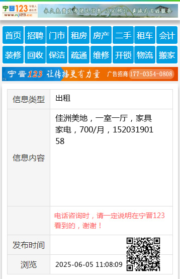佳洲美地,一室一厅,家具家电,700/月,15203190158