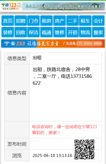 出租,铁路北宿舍,28中旁,二室一厅,电话13731586622