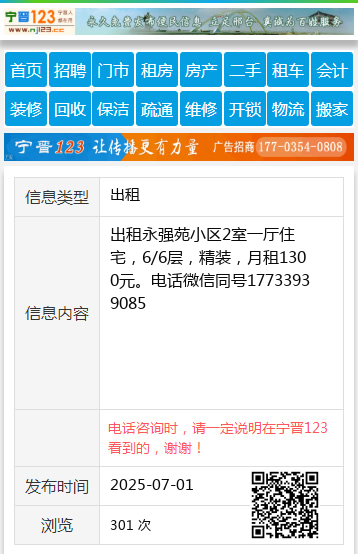 出租永强苑小区2室一厅住宅,6/6层,精装,月租1300元。电话微信同号17733939085