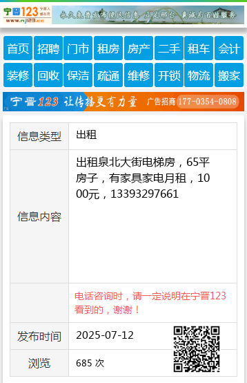 出租泉北大街电梯房,65平房子,有家具家电月租,1000元,13393297661