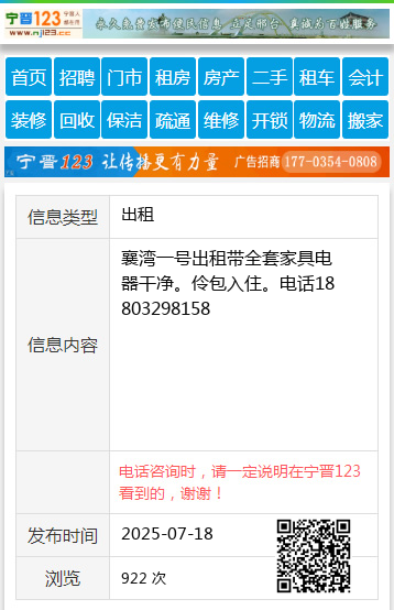 襄湾一号出租带全套家具电器干净。伶包入住。电话18803298158