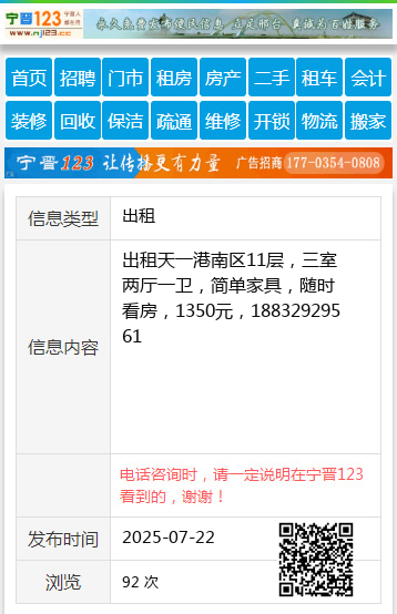 出租天一港南区11层,三室两厅一卫,简单家具,随时看房,1350元,18832929561