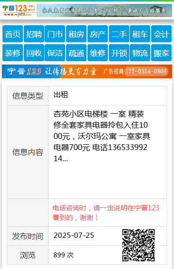 杏苑小区电梯楼 一室 精装修全套家具电器拎包入住1000元,沃尔玛公寓 一室家具电器700元 电话13653399214