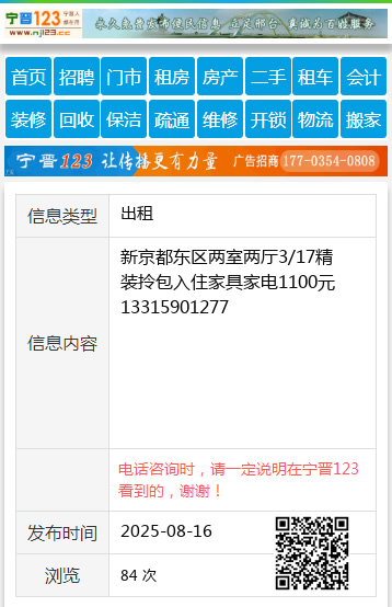 新京都东区两室两厅3/17精装拎包入住家具家电1100元13315901277