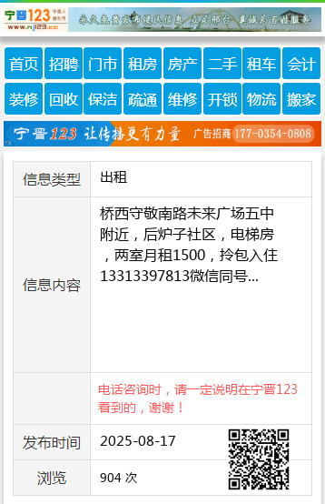 桥西守敬南路未来广场五中附近,后炉子社区,电梯房,两室月租1500,拎包入住13313397813微信同号