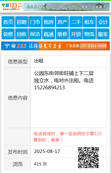 公园东街邻街旺铺上下二层独立水,电对外出租。电话15226894213