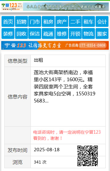 莲池大街高架桥南边,幸福里小区143平,1600元。精装四居室两个卫生间,全套家具家电5台空调,15503195683