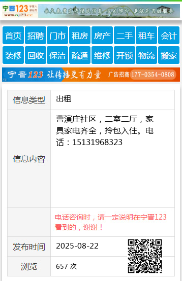 曹演庄社区,二室二厅,家具家电齐全,拎包入住。电话:15131968323