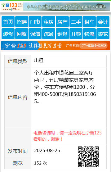 个人出租中银花园三室两厅两卫,五层精装家具家电齐全,停车方便整租1200,分租400-500电话18503191065