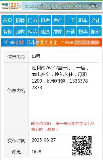 胜利南76平2室一厅,一层,家电齐全,拎包入住,月租1200,长租可谈,13363787873
