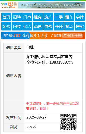 顺都府小区两室家具家电齐全拎包入住。18831988795